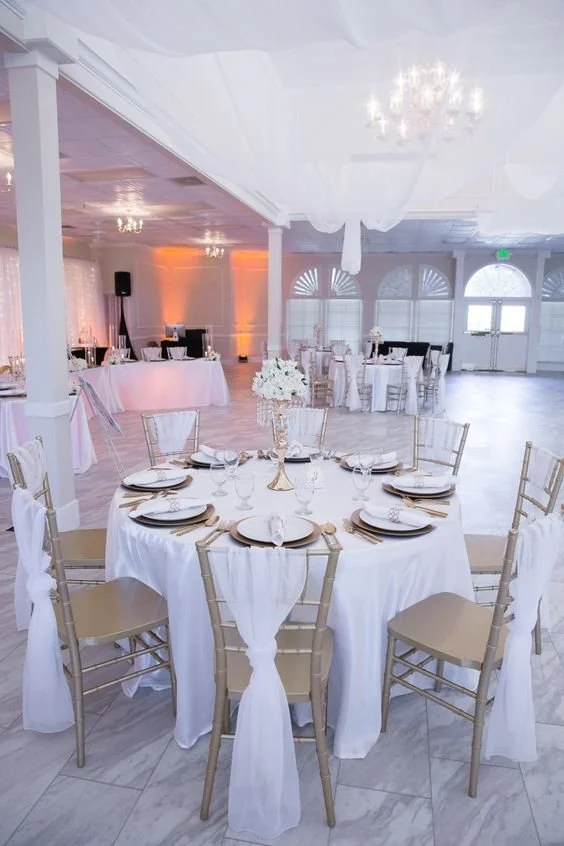 Included amenities are 25 - 5’ round tables, 2 cocktail tables, 250 gold Chiavari chairs, 240 white folding chairs, 15 - 8’ banquet tables, 4- 6’ banquet tables, and 2 - 4’ tables.
